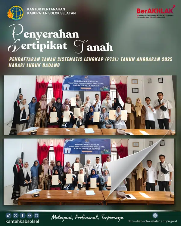 Kantor Pertanahan Kabupaten Solok Selatan melaksanakan penyerahan sertipikat tanah dalam rangka Program Strategis Nasional melalui kegiatan Pendaftaran Tanah Sistematis Lengkap (PTSL) pada Selasa, 13 Januari. Kegiatan tersebut dipusatkan di Nagari Lubuk Gadang, Kecamatan Sangir, Kabupaten Solok Selatan, dan diikuti oleh masyarakat penerima sertipikat tanah.