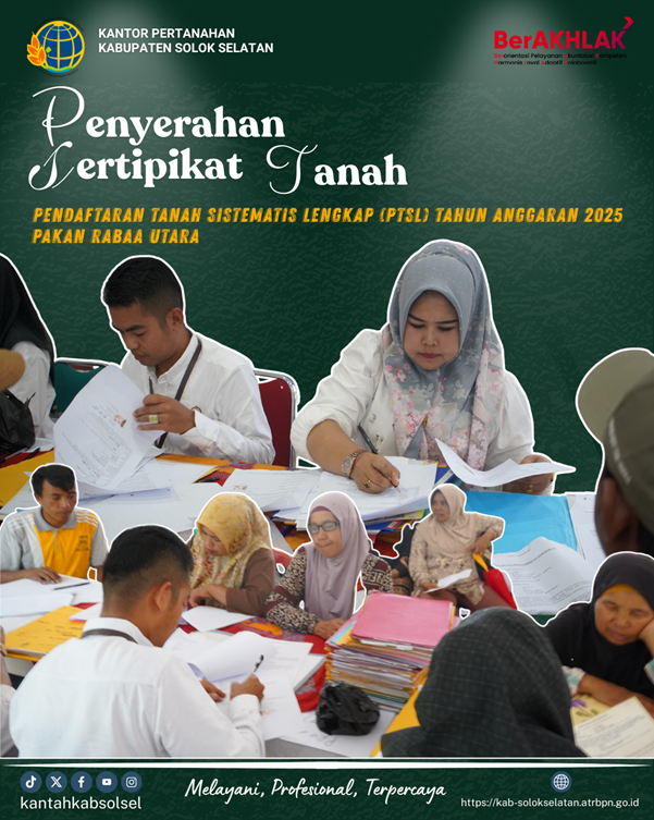 Kantor Pertanahan Kabupaten Solok Selatan melaksanakan kegiatan penyerahan sertipikat tanah dalam rangka Program Strategis Nasional melalui Pendaftaran Tanah Sistematis Lengkap (PTSL) pada Rabu, 07 Januari. Kegiatan tersebut berlangsung di Nagari Pakan Rabaa Utara, Kabupaten Solok Selatan, dan dihadiri oleh masyarakat penerima sertipikat, unsur pemerintah nagari, serta jajaran Kantor Pertanahan Kabupaten Solok Selatan.